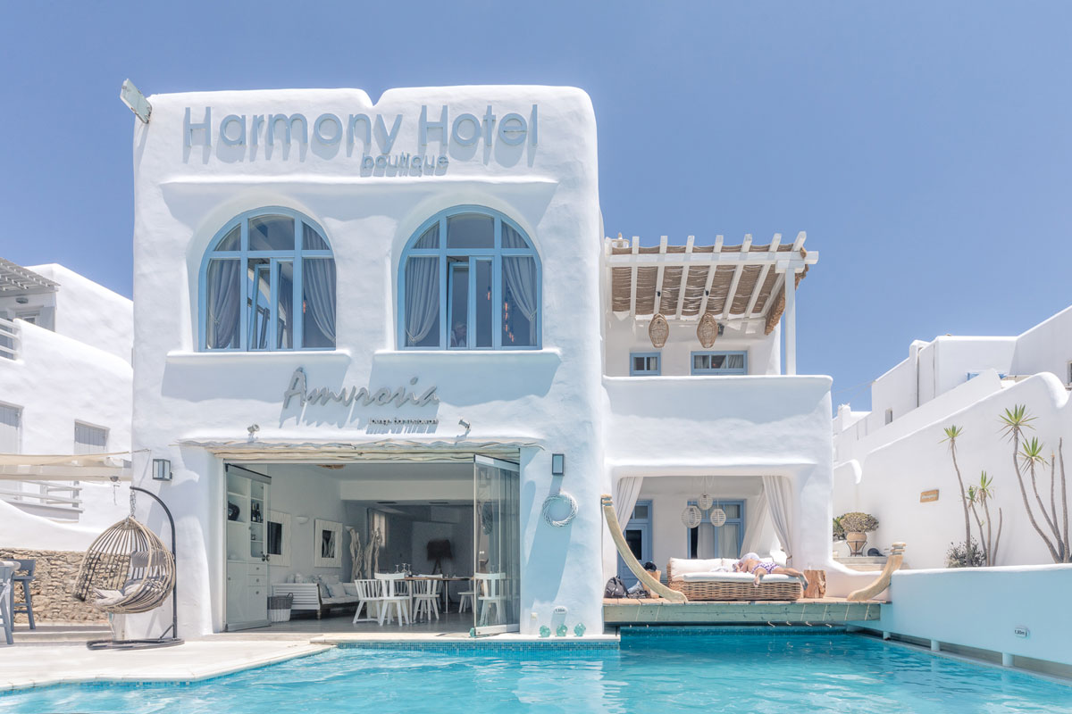 Harmony Boutique Hotel is a new built luxurious hotel right in front of the old port. Its location, at the heart of Mykonos Town makes it the meeting point for all people, guests and visitors. This hotel really justifies its name as it sets in a serene surrounding with bright colours and soft lighting. Big glasses are all around it letting the sun and the sea breeze in. The hotel is surrounded by white stone fences secluding it from the indiscreet.